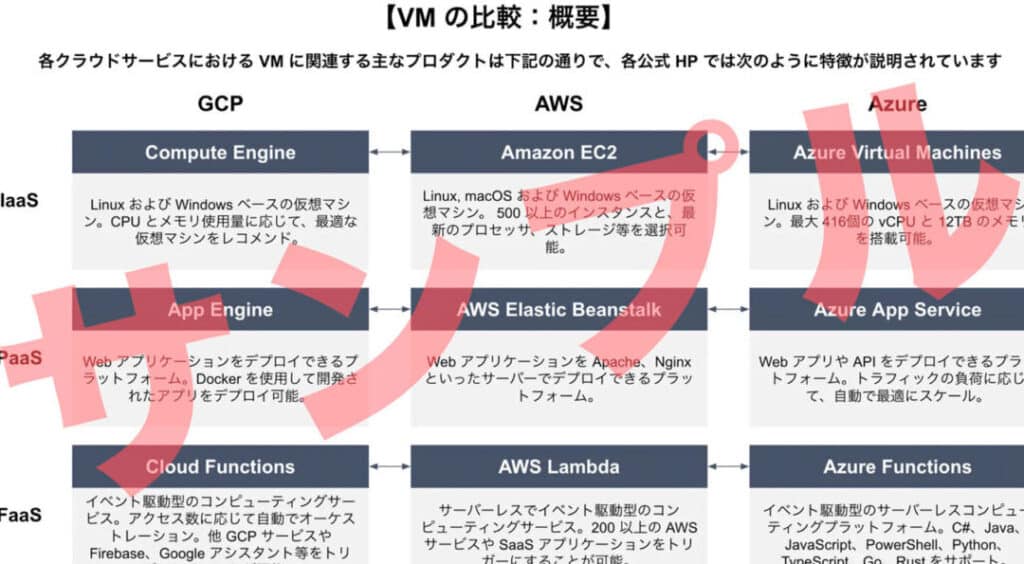 - 料金設定:AWS、Azure、GCPの料金設定には微妙な違いがありますが、おおむね同じ差異があります。
